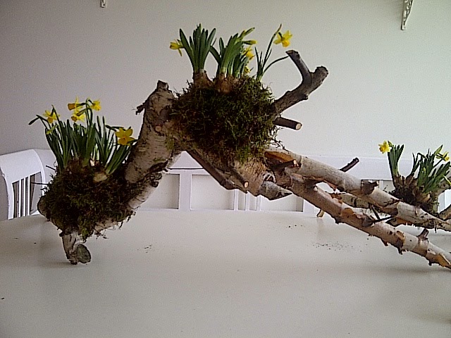 Ik had het verzorgen van de bloemen ook op me genomen, ook iets waar ik altijd veel plezier aan beleef. Mijn schoonvader weet dat en hij had maanden geleden al een partijtje snoei afval bij mij achter het huis gegooid, en zei toen: " Hier ontstaat vast wel een keer weer iets moois uit…" Op het moment dat het hier kwam liggen had ik er geen plannen mee, toch schoot me bij de voorbereidingen voor de vrouwendag meteen door het hoofd dat ik wel iets met het hout kon doen. En zo kwam het dat op iedere tafel in de zaal een stronk hout kwam te liggen met narcissen erop gebonden en mos eromheen. Het stond mooi en fijn om geen gedoe met water geven te hebben, bollen hebben natuurlijk genoeg vocht in zichzelf!